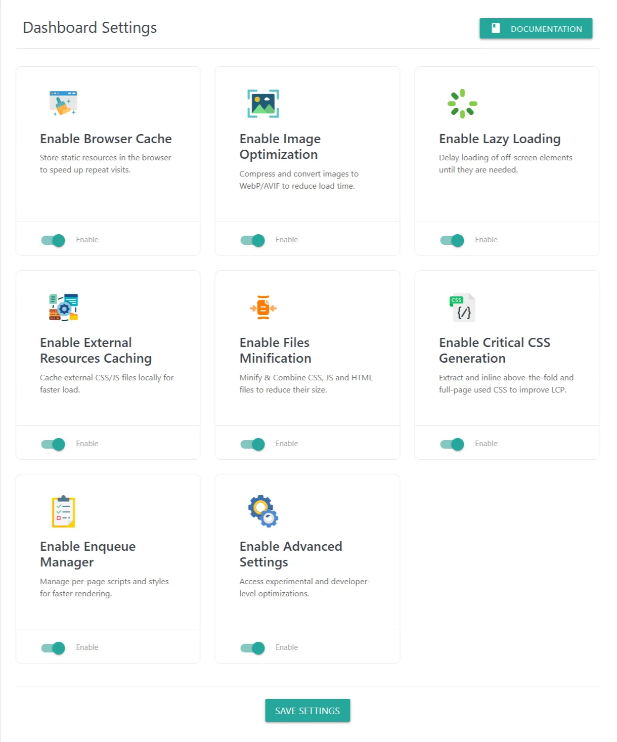 The Dashboard Settings screen gives you a quick, centralized way to enable or disable major optimization modules in the plugin. Each module focuses on improving performance, speeding up page loads, and enhancing Core Web Vitals.