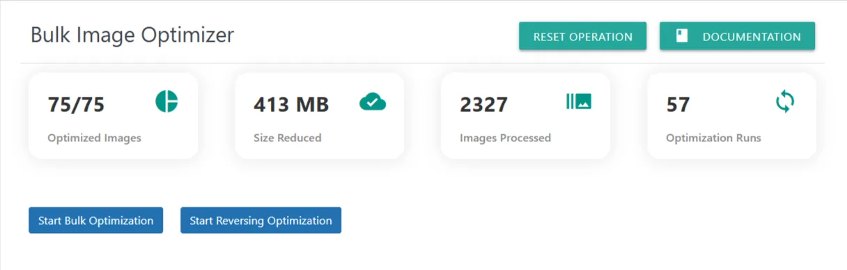 The Bulk Image Optimization dashboard provides a complete overview of your site-wide image optimization activity. This section allows you to optimize all images in bulk, reverse optimization if needed, track total size savings, and monitor processing cycles.